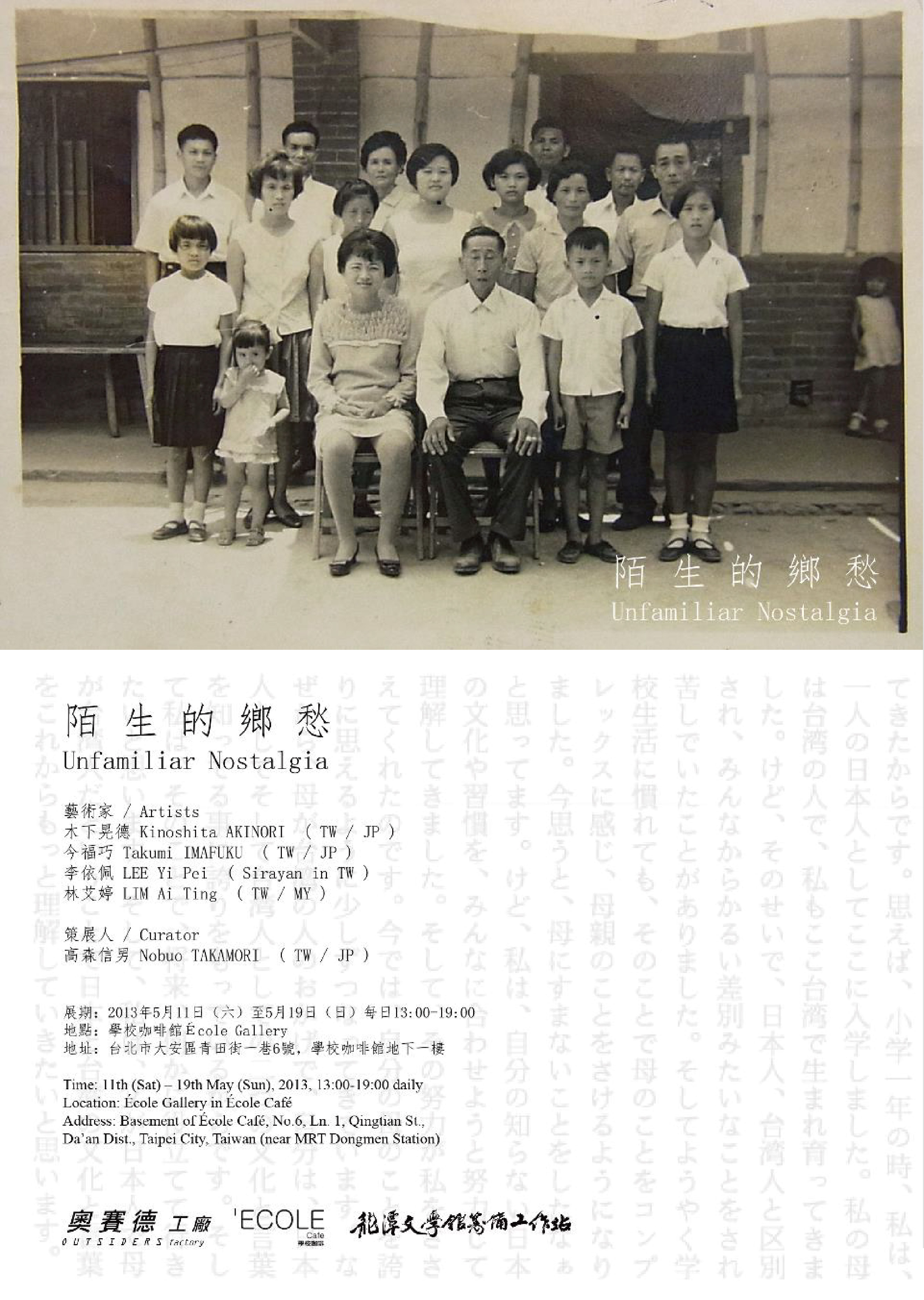 如果在遠方有個陌生的家鄉,那會是個怎樣的地方?如果成長的土地是片陌生的沃土,鄉愁會是什麼形狀?這個展覽的目的不為了要展示「專業」的藝術品,而是企圖在國族認同以及文化交疊的灰色地帶回探「家鄉」作為自身生命史內探的可能性。策展人高森信男、和藝術家木下晃德及今福巧雖然流著日裔的血脈,然而這三位藝術工作者生命中大多數的時間卻都在台灣這個島嶼成長和生活;藝術家李依佩(同時是位策展人)則是發現,自身身為原住民的身分如同幽靈一般,看不到絲毫具體的痕跡,但卻默默地引領著她回探祖靈棲居的故里;藝術家林艾婷則是決定離開馬來半島這個既熟悉又陌生的家鄉,選擇在台灣展開她的新生活。對於台灣藝術圈而言,這些藝術工作者的名字都是陌生的名字:因為有的創作者,其文化成長經驗太偏離台灣的主流族群和台灣追求國際化敘述的努力;有的創作者甚至必須苦於簽證和居留的問題,無法有時間和空間深化其藝術創作。