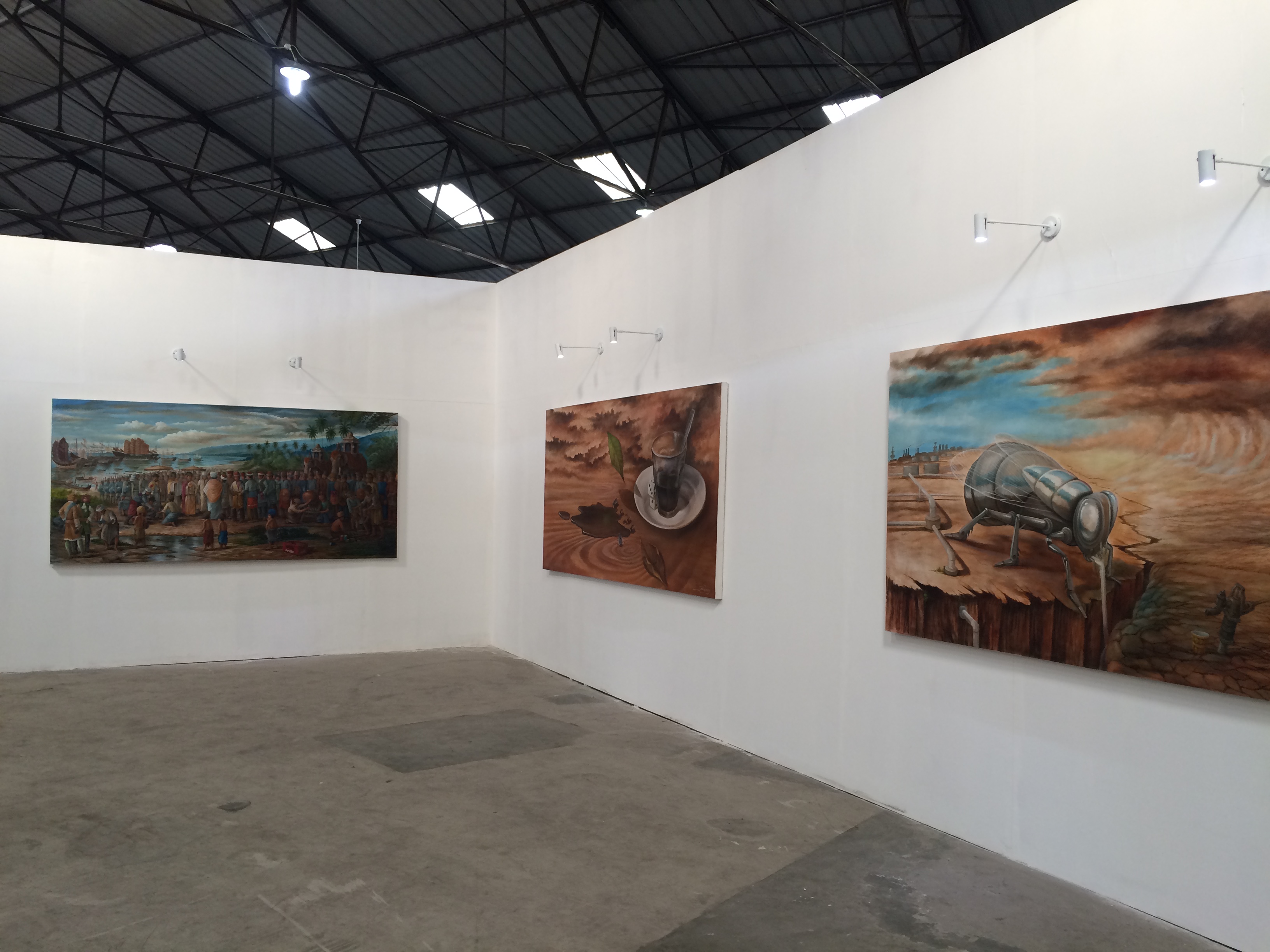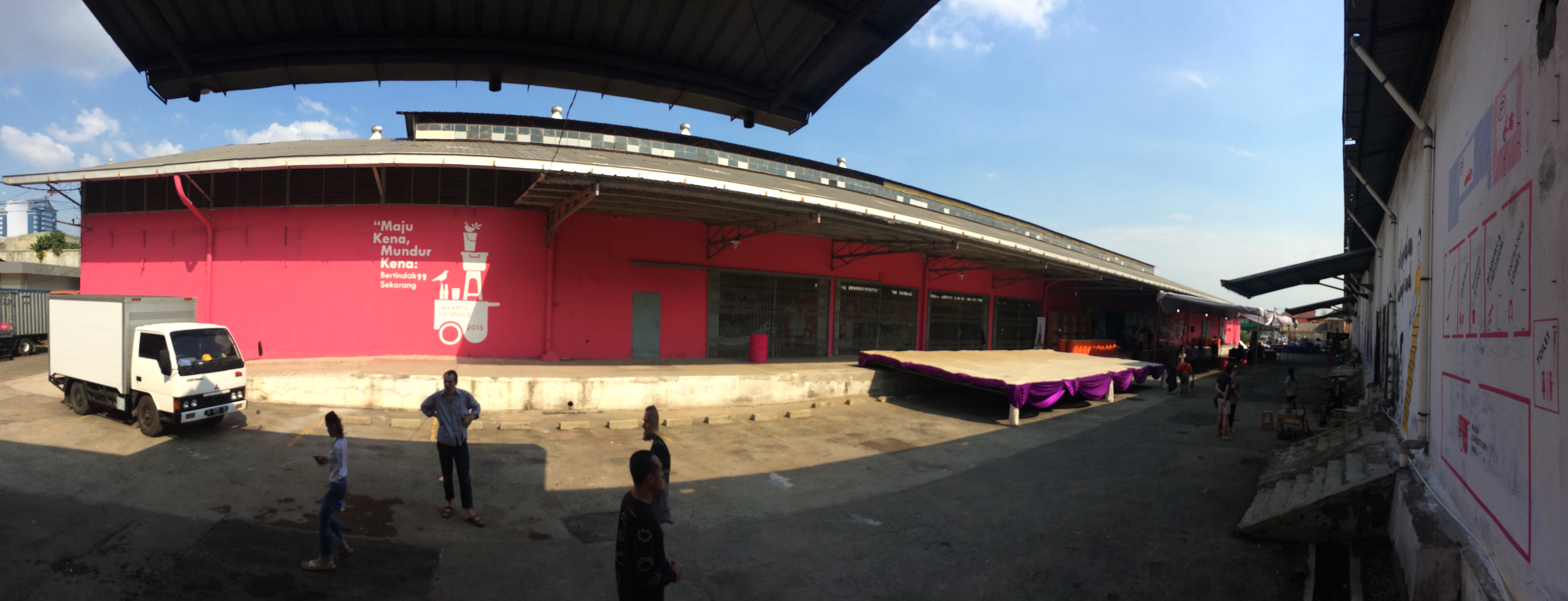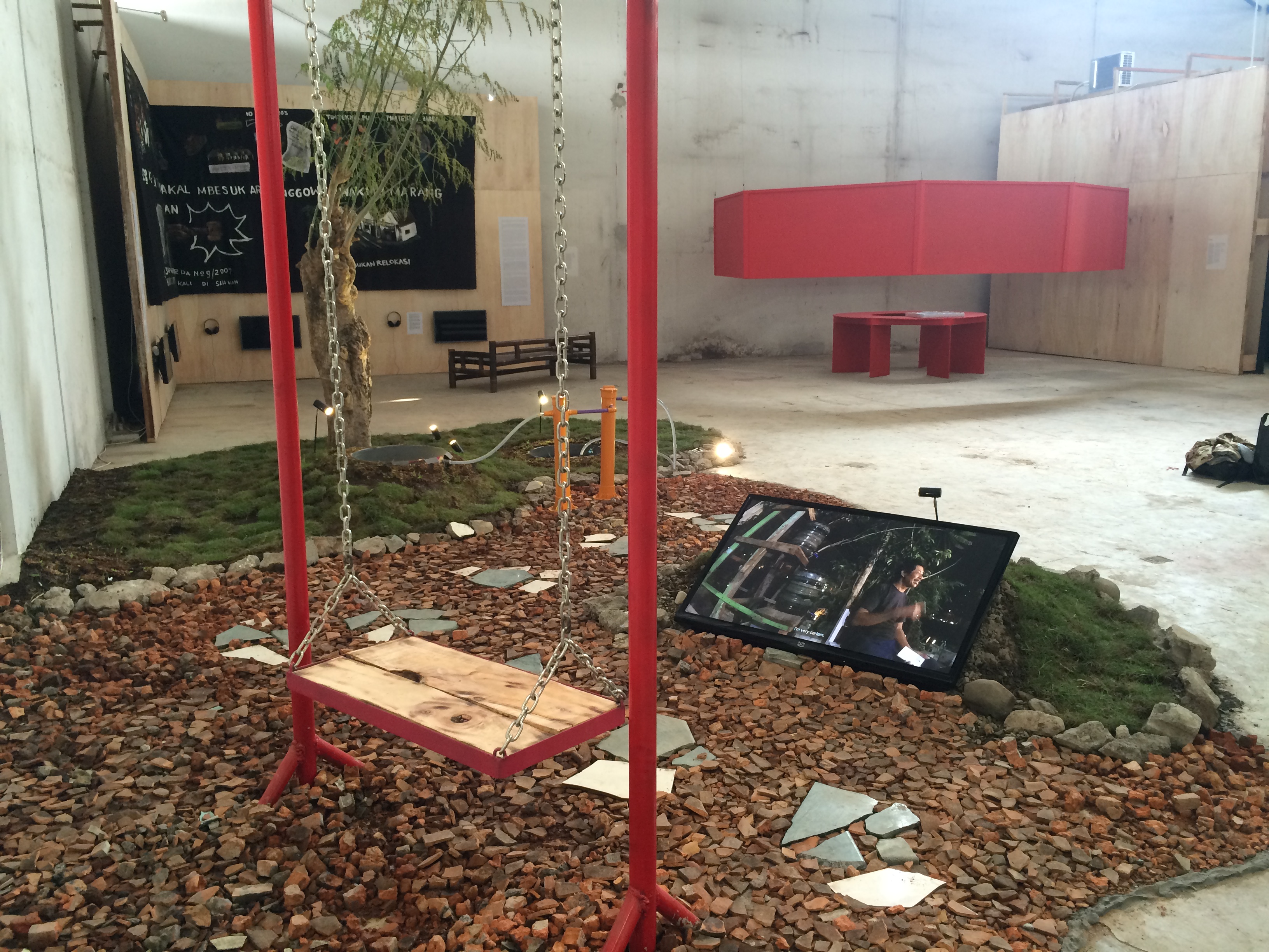 在印尼什麼事情都有可能發生,這裏的狀態,使得雙年展走出美術館白盒子框架,在兩大棟寬敞的倉庫展覽,第一棟可以看到接待空間、有商店、孩童區、媒體區和休息區,隔壁有攤販集中飲食區,在最旁邊還有屬於滑板、單車愛好者的滑板區,裏頭正有人拍著電影。接著往後走到第二棟,便是主要展覽區,對筆者來說,很難一眼分辨六位策展人的特色,或者可以說這個雙年展的氛圍加強了印尼腹地龐大的各地區溝通合作。