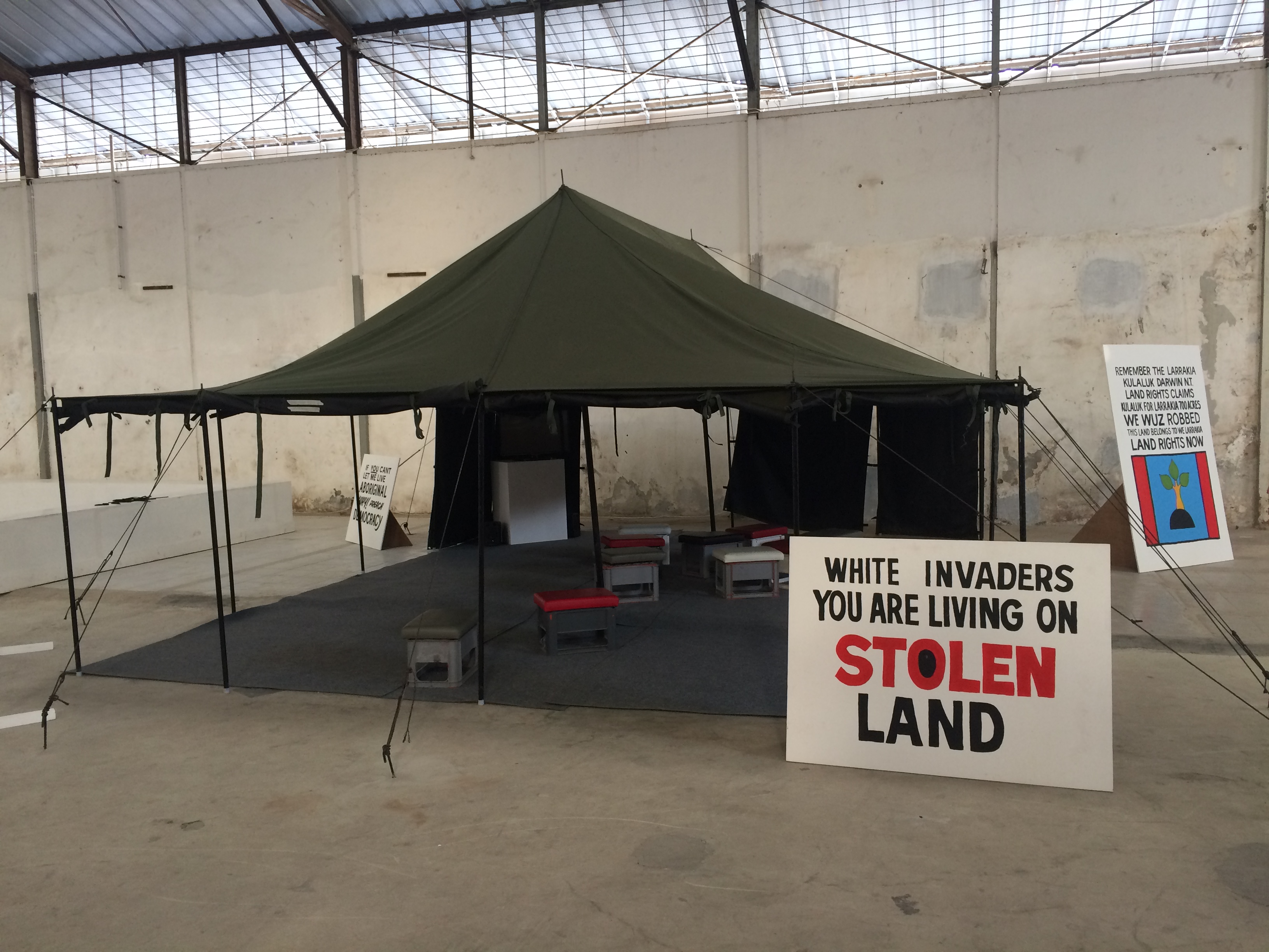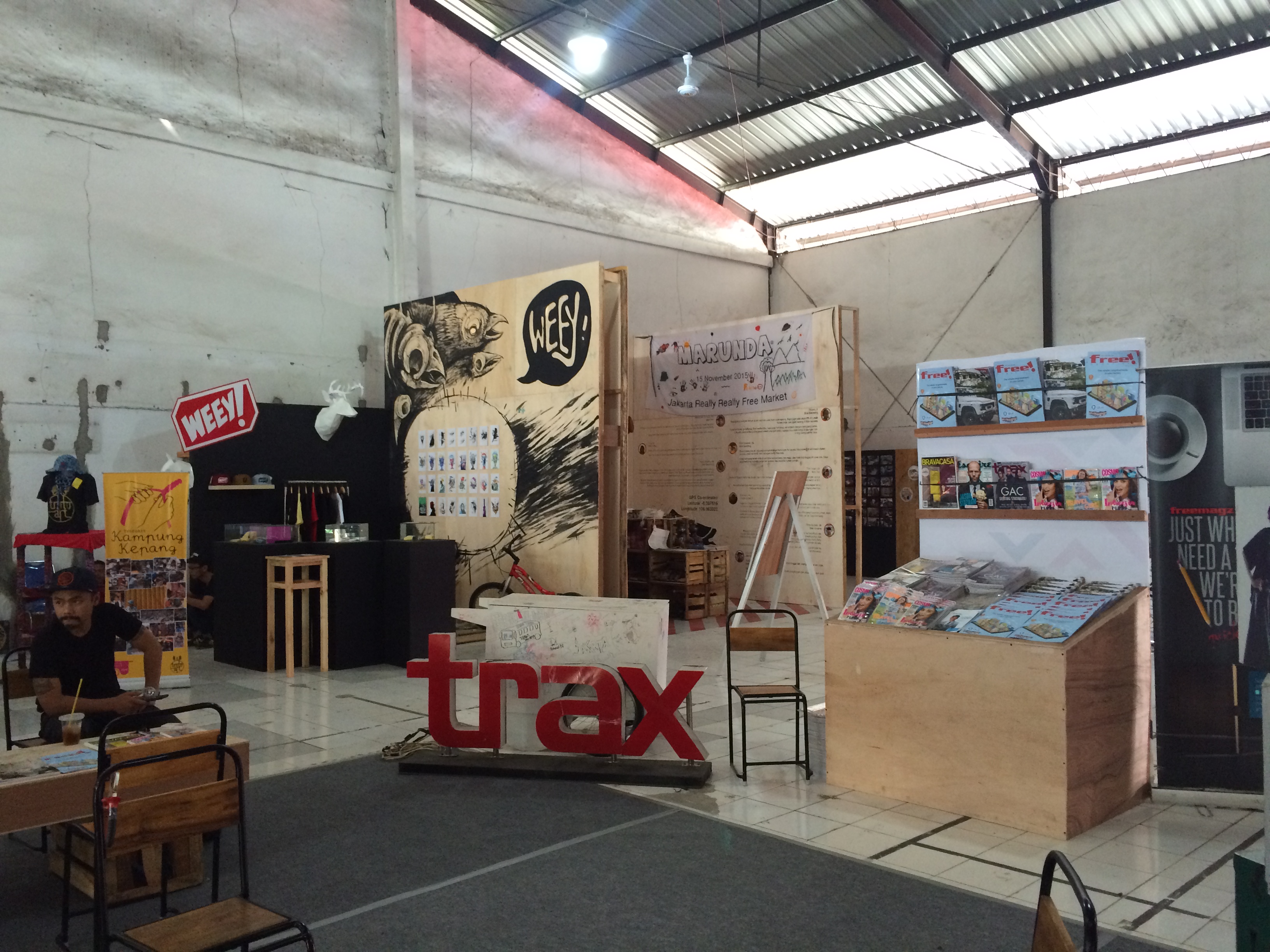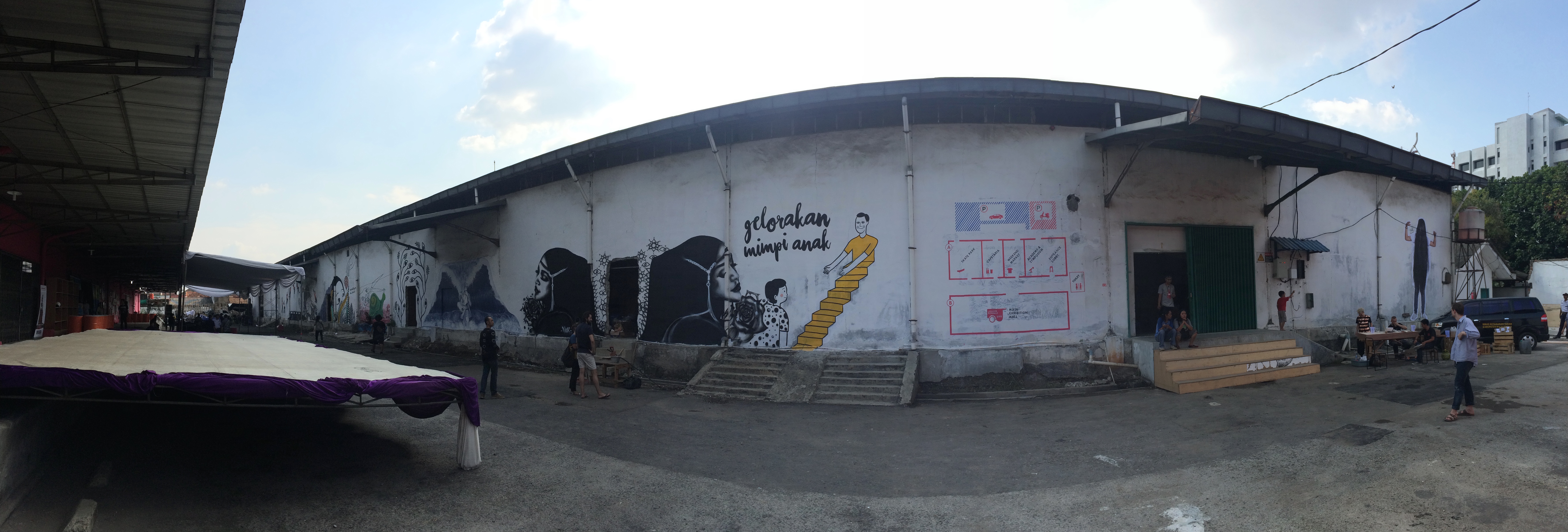 在印尼什麼事情都有可能發生,這裏的狀態,使得雙年展走出美術館白盒子框架,在兩大棟寬敞的倉庫展覽,第一棟可以看到接待空間、有商店、孩童區、媒體區和休息區,隔壁有攤販集中飲食區,在最旁邊還有屬於滑板、單車愛好者的滑板區,裏頭正有人拍著電影。接著往後走到第二棟,便是主要展覽區,對筆者來說,很難一眼分辨六位策展人的特色,或者可以說這個雙年展的氛圍加強了印尼腹地龐大的各地區溝通合作。