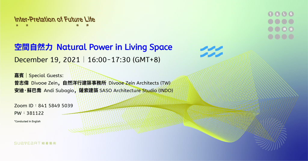 自然洋行建築圑隊的曾志偉總監,透過創作過程的梳理,他認為建築空間是整體環境氛圍其中元素之一,藉由人為構造體及地貌因素,將建築空間轉化成為自然與人之間的一種空間介質,回溯居住原始初衷,探索新生活實驗可能性。當台灣建築師遇見印尼建築師,相似的共同生命經驗中,不曉得會碰撞出什麼火花?
