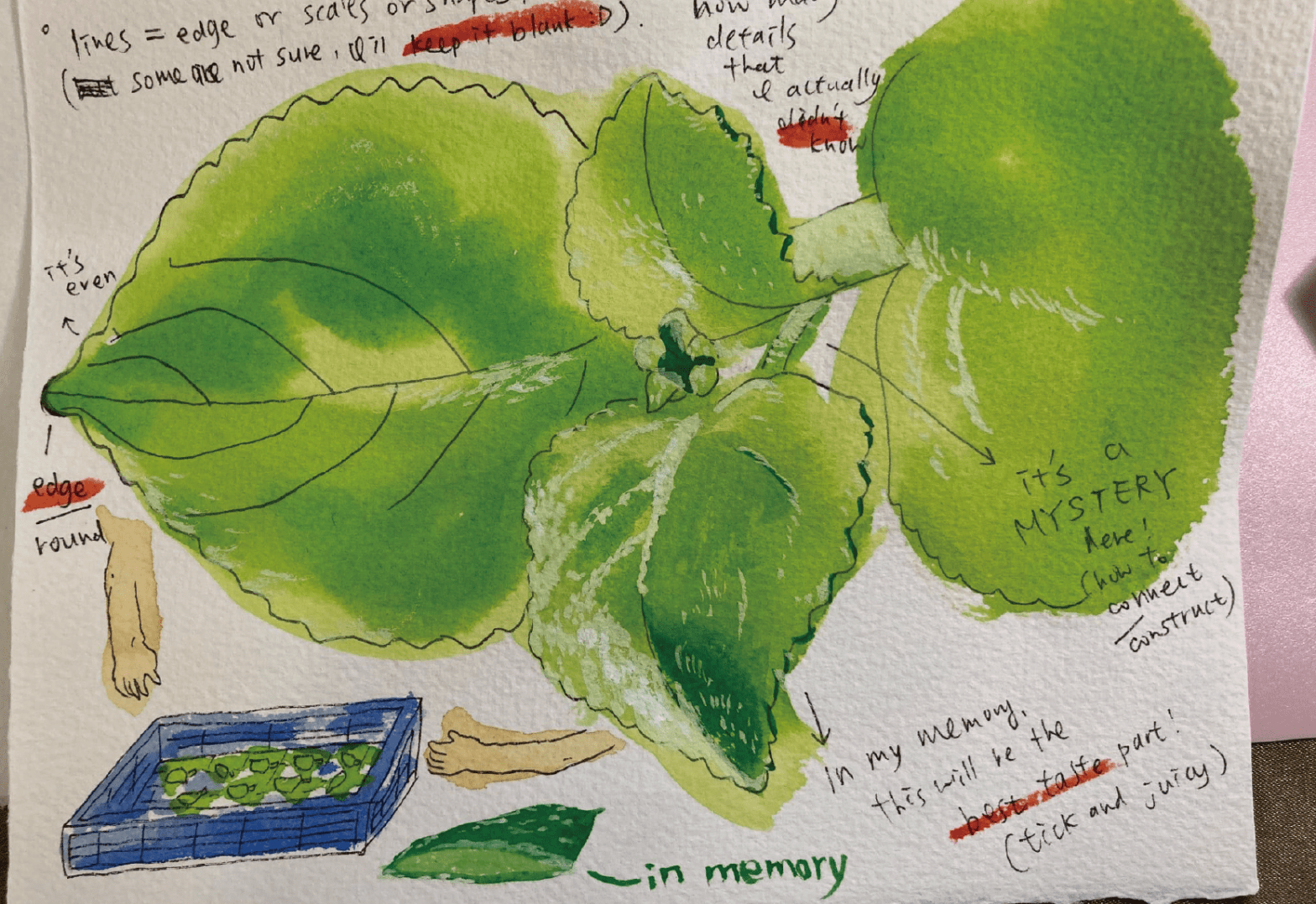 When I drew it in the workshop, I realized that I could distinguish which part of the leaf I don’t know- in the past, I pretended that I could draw some lines to show that it is a leaf. However, since I only had a picture in my hand, it’s enjoyable to realize the details of Coleus amboinicus I don’t know. For instance, the edges of the leaf were round instead of sharp; “veins” were parallel to the central vein till the edge of the leaf. And I also kept some MYSTERY parts blank. (Cause no matter how zoomed-in I did to the picture, I still only got one perspective). It might echo what Trevor recommended to us to “observe overtime/ return” so that I could pick up different images of the same leaf at other times. Or tried different lights, “backlighting” for instance.