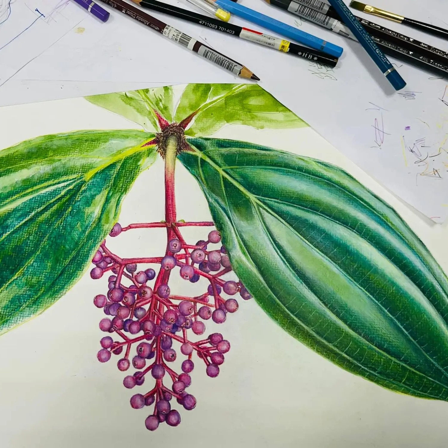 My love for Taiwan medinilla has never diminished with the passage of time, and I have produced hundreds of seedlings from cuttings and seeds. In terms of ecology, I have surveyed more than 30 sites across Taiwan medinilla’s entire range in the Hengchun Peninsula and collected at least five or six specimens. In terms of art, I have taken pictures and drawn illustrations of this beautiful plant. Beyond the art, I have risked my life by climbing high up on rock walls and within tree canopies to collect the branches and fruits.