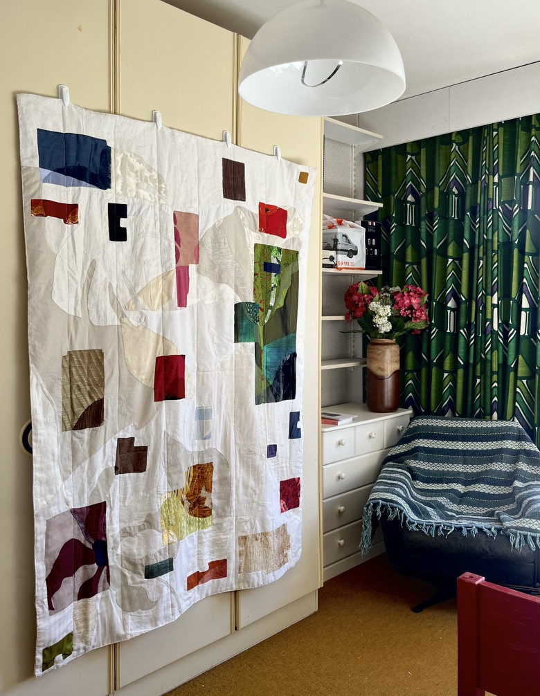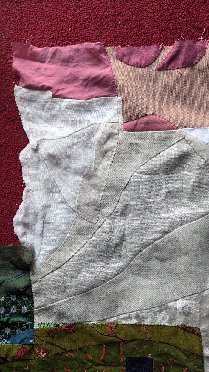 Patchwork felt like a natural response to my experience in Schubertstrasse. It is a technique that echoes the fluidity and multiplicity of diasporic identities, both in its form – adaptable and born of thriftiness and creative reuse – and in the way it has been passed down through generations and across cultural traditions. For instance, Stuart Hall describes diasporic cultural identity as not ‘being’ but ‘becoming‘, and Philip A. Kuhn writes of departure as connection not separation, two concepts that are embodied in the act of patchworking itself. Through stitch, you are building a whole out of parts, bringing them together in dialogue with one another, and creating something new out of something old, often with the intention that it can in turn be repaired and reinterpreted in the future.