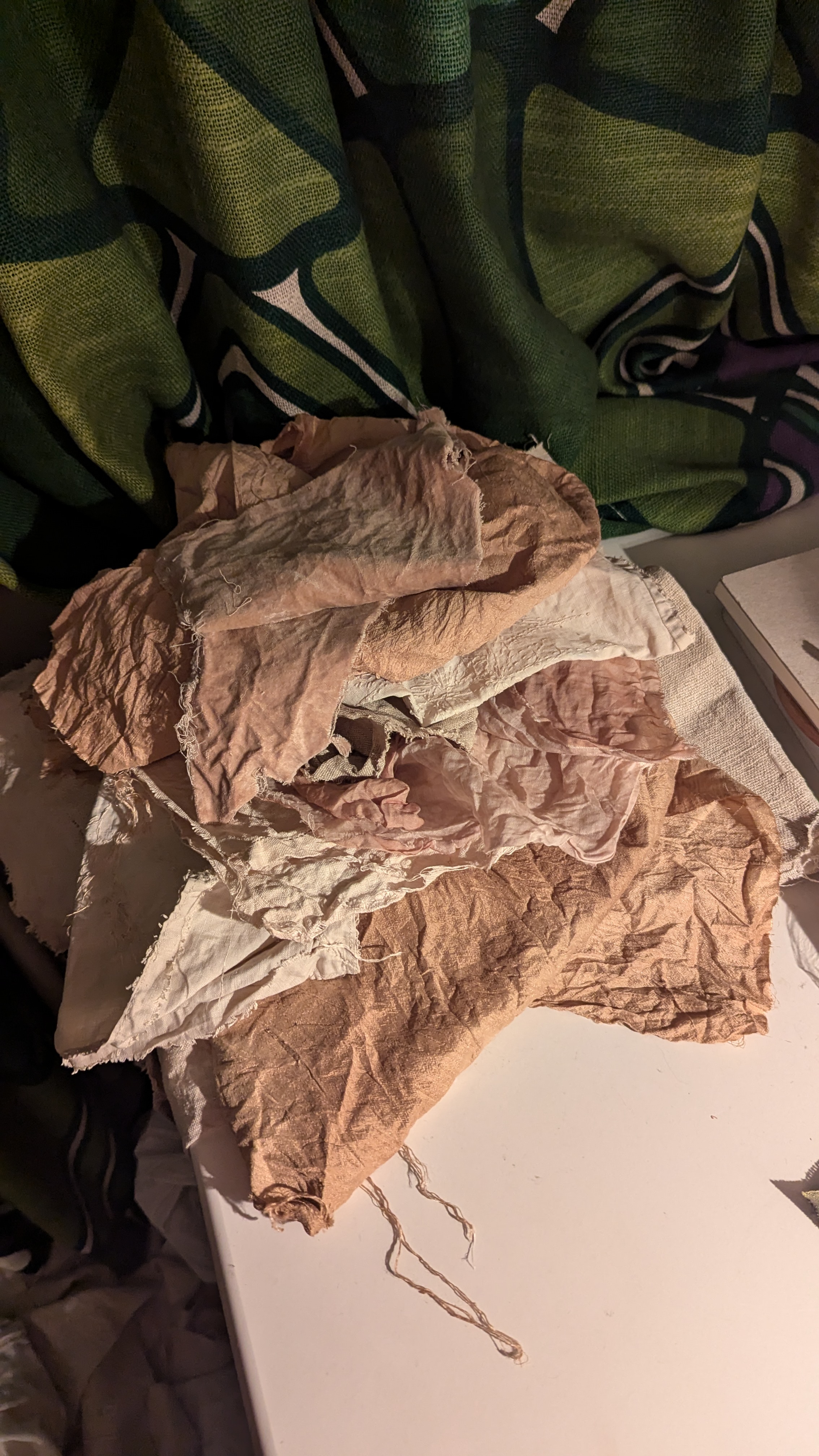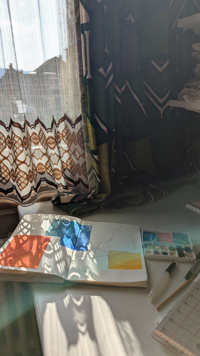 The quilt that I made during the residency, Kinship, and the accompanying zine (which illustrated some of the processes and reflections on my time in Schubertstrasse) used fabrics found in the house, from scraps of batik to offcuts from clothing and furnishings. Silk and linen are prominent, referencing Zurich’s textile production history, and the cross-cultural exchange apparent in shaping the international textiles trade and, in turn, the city’s industrial landscape. Hand-dyed fabrics and accompanying tetrapak prints also use materials discarded through the course of the residency (milk cartons, teabags, and avocado pits) tracing our time spent here, and the collective activities of making pots of tea, cooking, and eating, which sustained us and formed the backdrop to our discussions.