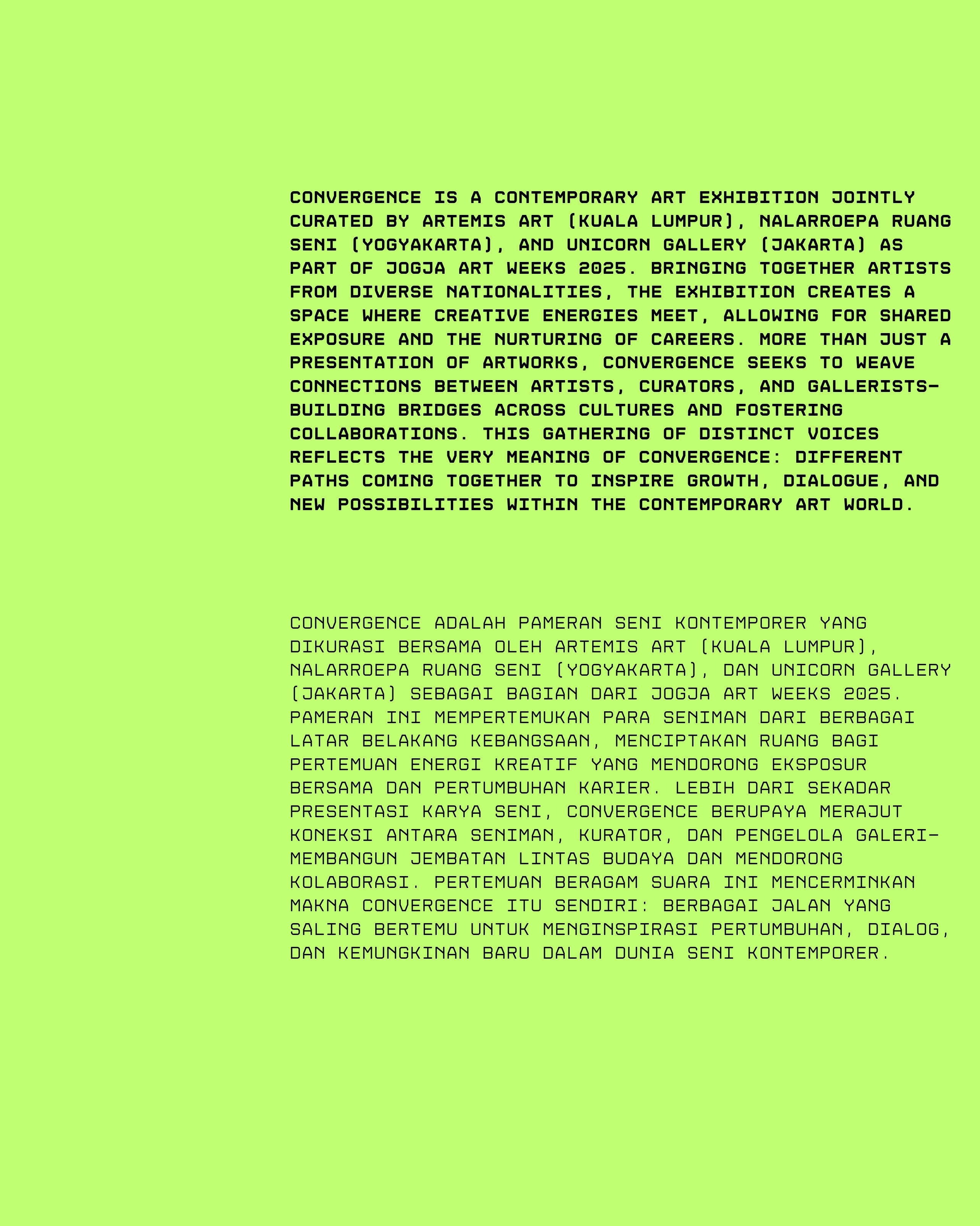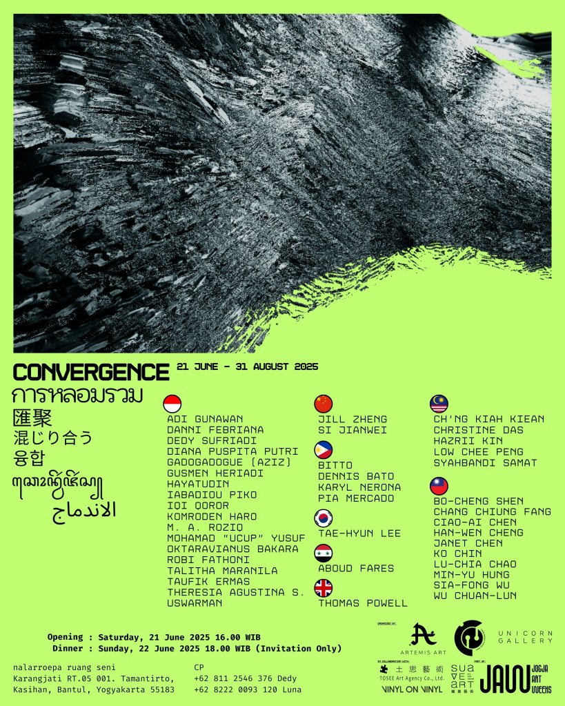 SUAVEART is delighted to announce that three of its collaborative artists — Wu Chuan-Lun, Jill Zheng, and Si Jianwei — have been invited to participate in Convergence, a contemporary art exhibition jointly curated by three significant Southeast Asian galleries and art space: Artemis Art (Kuala Lumpur), Nalarroepa Ruang Seni (Yogyakarta), and Unicorn Gallery (Jakarta). Presented as part of Jogja Art Weeks 2025, Convergence is an official event within one of the region’s most vibrant art festivals.