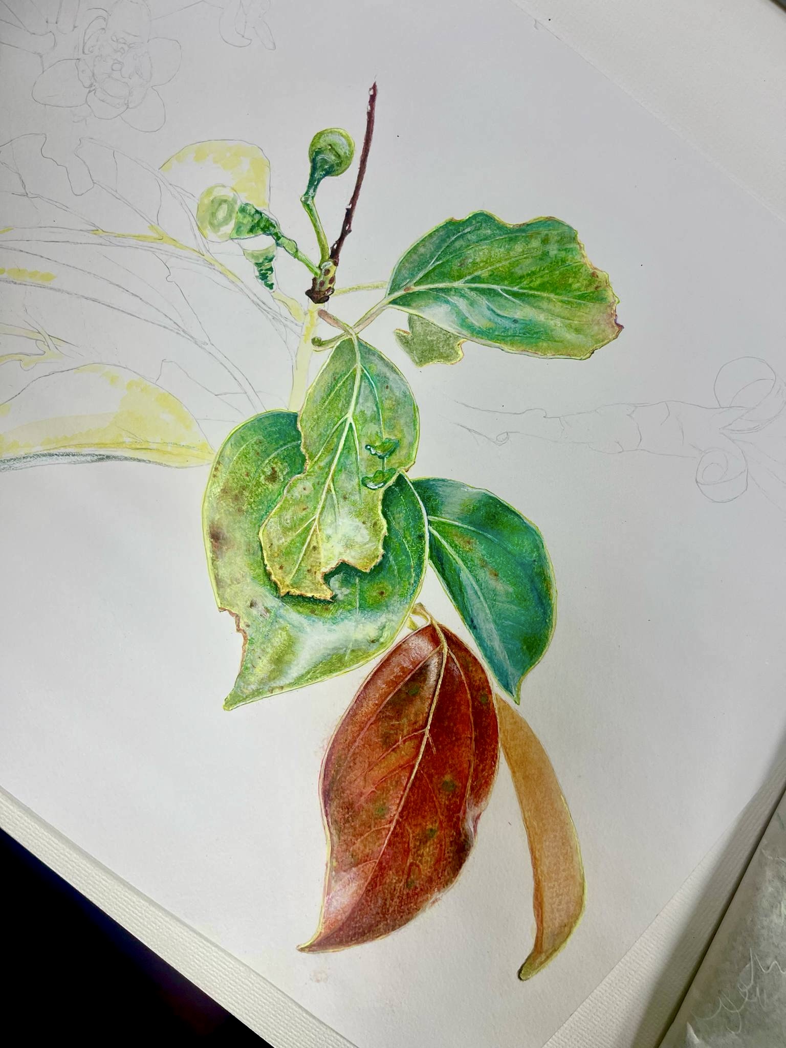 Today, my connection with stout camphor continues in a new form: I paint it. Using the tree as a subject of art feels like continuing an unfinished conversation with an old companion.