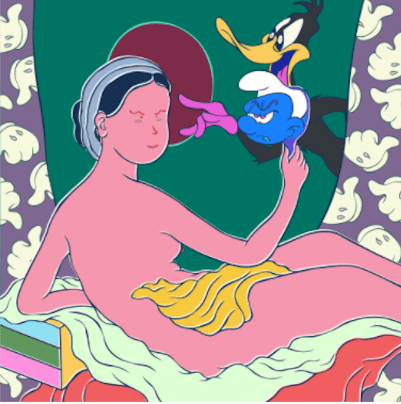 In the work “Move on, There’s Nothing To See Here.” He referenced “The Toilet of Venus“, the imagery signifying nowadays Hedonism, cartoon character The Smurfs like the spokesperson of the magic mirror, and the selfish, showy and confident Daffy Duck seems to represent the real self under the mask. Through humor and satire, he does everything imaginable and turns all the emotions and symbols into creative practice. Intuition is important for an artist’s to shape the art work, the image is hidden with multiple thinking directly or indirectly.