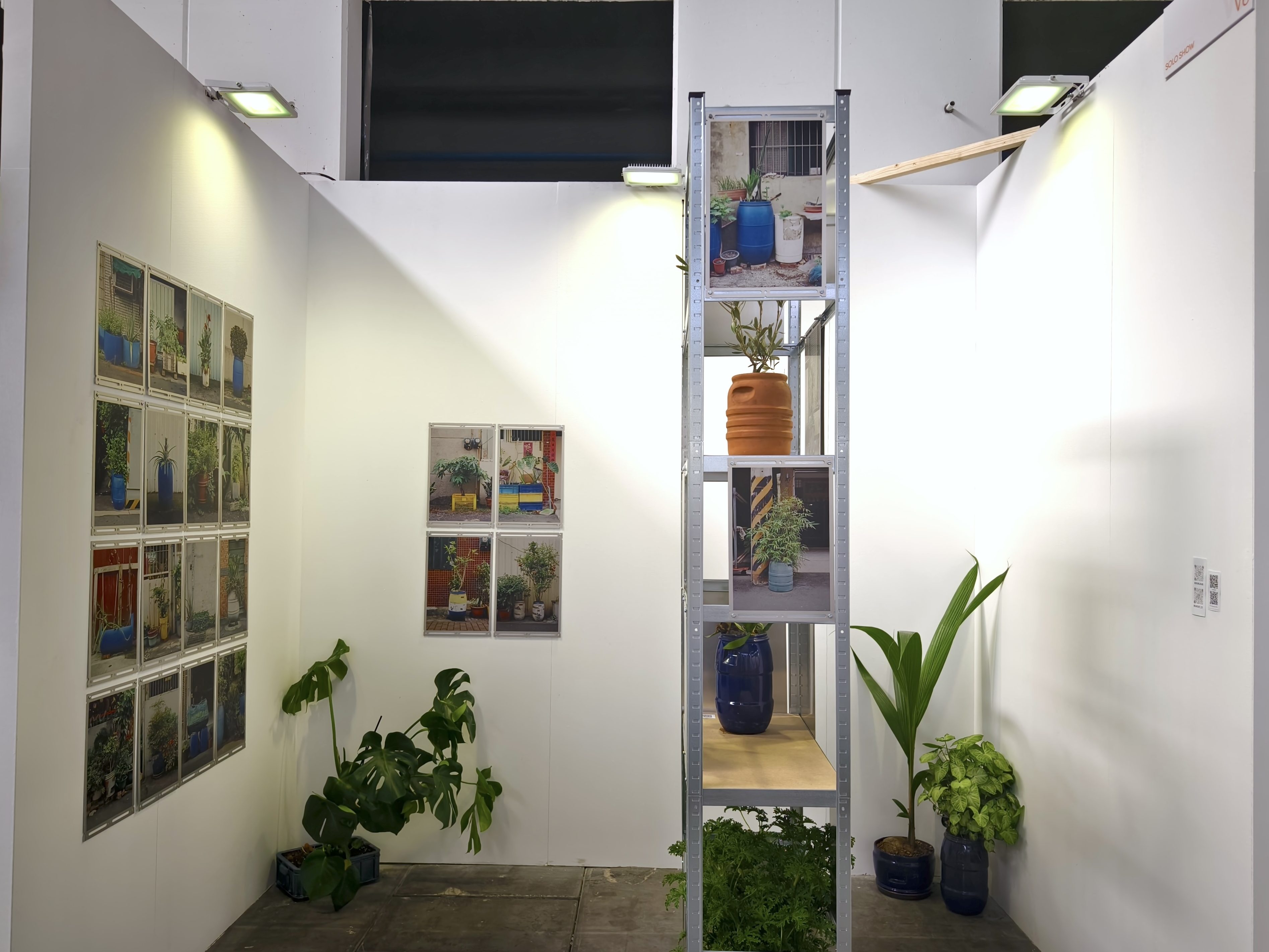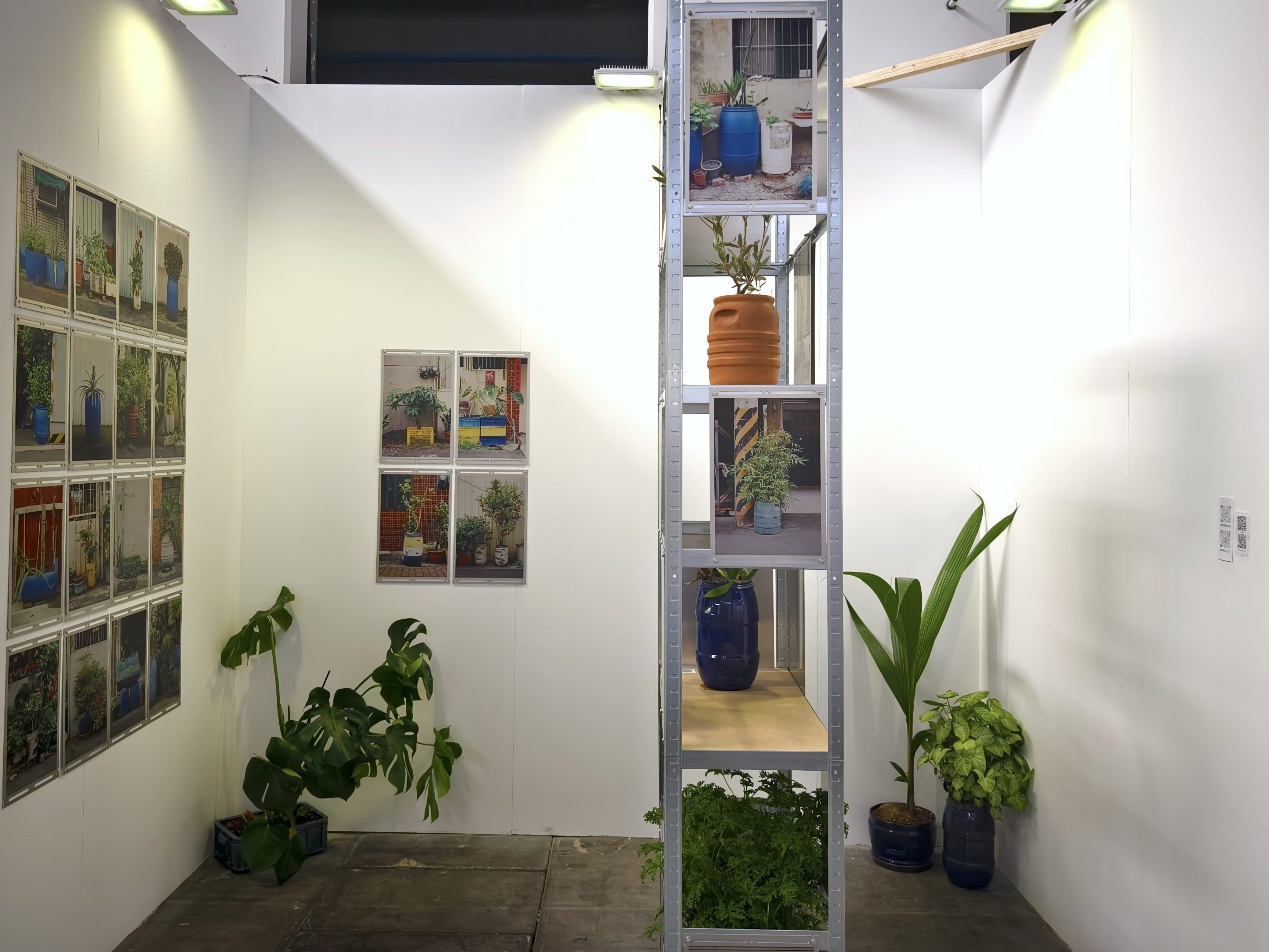 我拍攝了這些盆栽,以類型學的方式歸納為圖鑑。裝置時,將他們印刷在鋁板上,讓材質本身光澤給出這些盆栽起源的暗示。照片的大小隨著植物而改變,但裡面的盆器維持一貫比例。最後,將這些塑膠容器的樣式精緻化後,以正規的陶瓷量產,成為植物的家。