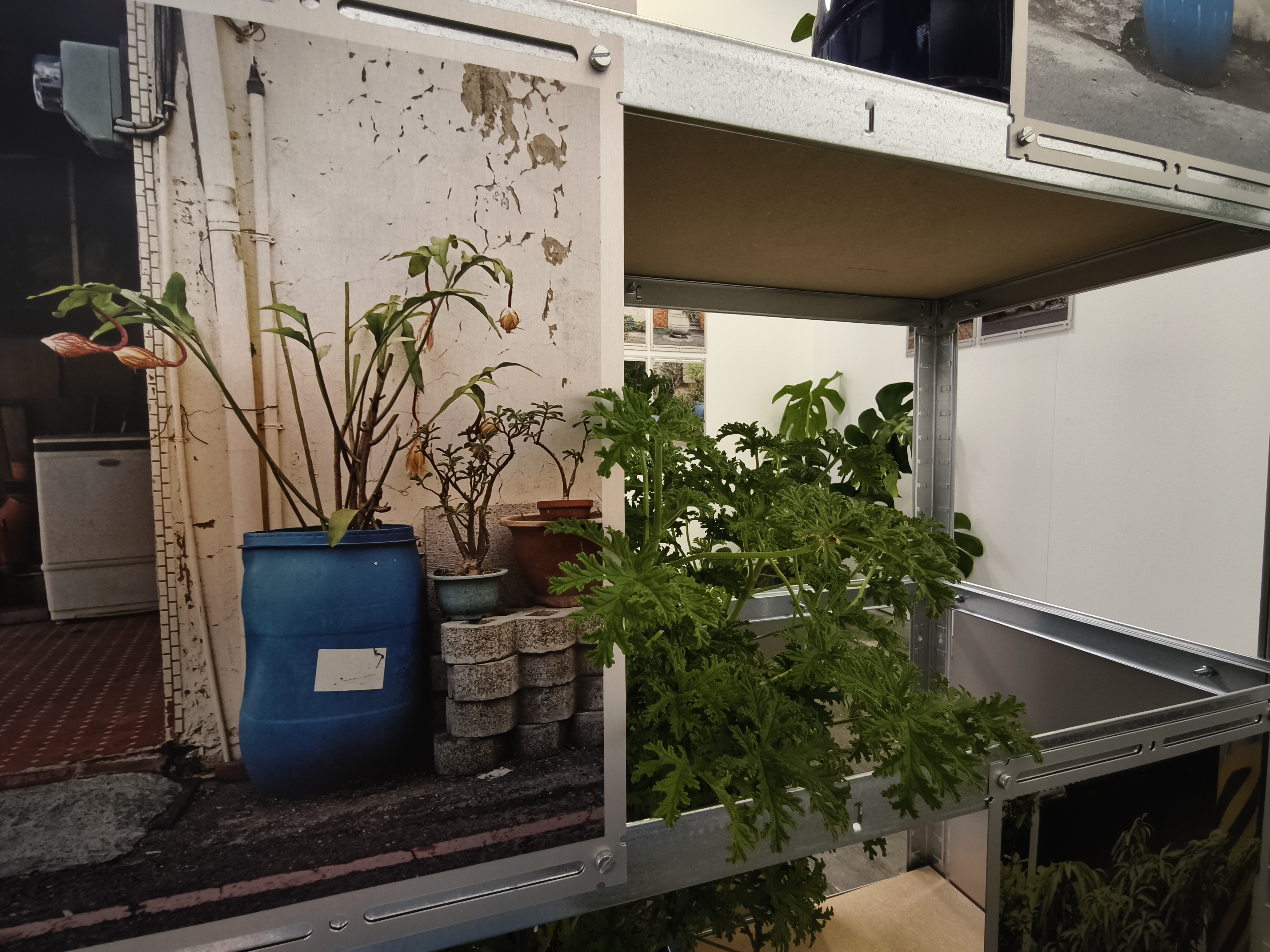 在台灣住工農界線模糊,社區與工廠接壤發展,家庭代工模式遺留背景之下 ,有些工廠淘汰的塑膠容器會被附近鄰居討去,藉由庶民再開發物件價值的異常天份成為了妝點門面的一叢叢花木──這是一種惜物的美德也是錯用的美學。當人情的妥協與有待完善的社會環境透過這些替代盆器得到微不足道的補償;扎根在生活種種將就之中的植物,即便植地不算精美,依舊得益於優勢風土在巷弄中生的盎然。