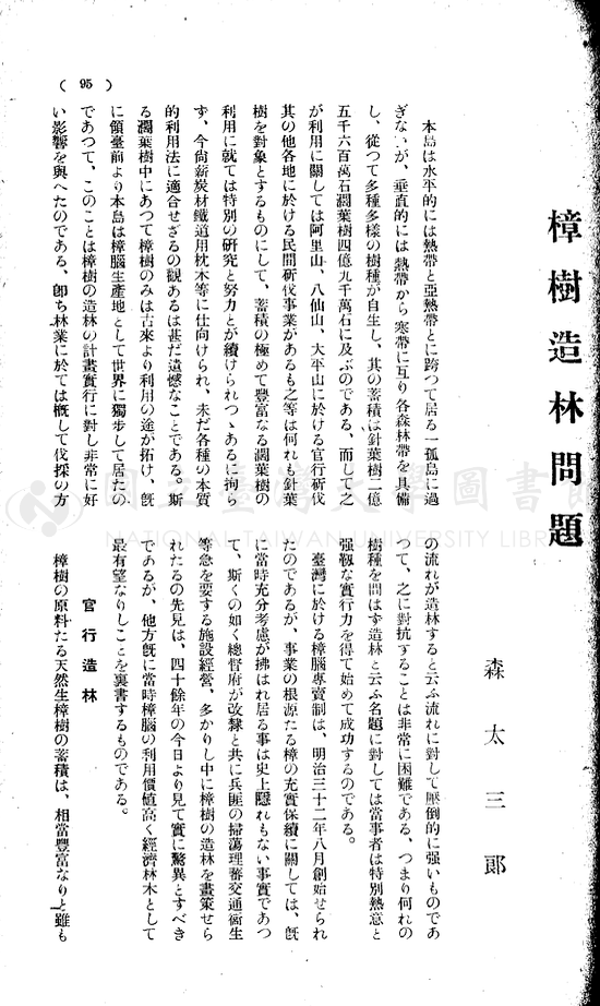 (Left) Article “The Issue of Camphor Tree Afforestation” from 森太三郎.