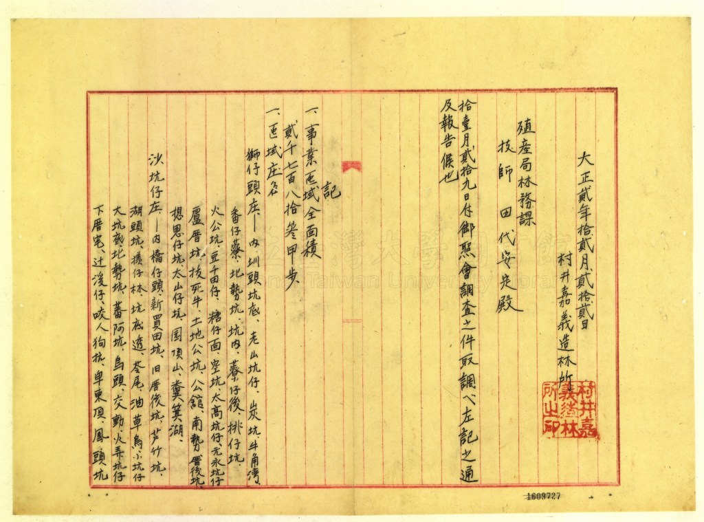 (Right) Letter from Murai of the Chiayi Afforestation Station to TASHIRO Antei [村井嘉義造林所致田代安定函] / 1913
