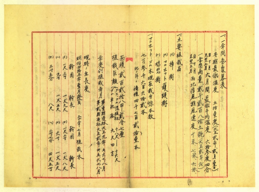 In 1899, as the international demand for camphor increased, technician OGASAWARA Tomijiro (小笠原富次郎) stressed the urgency of independently implementing an afforestation plan to maintain production. In the same year, technician TASHIRO Antei surveyed the forests along the Beishi River in the Wenshan District and found that while there were few camphor trees, their quality was superior to those in other areas. He recommended that to properly care for camphor seedlings, it was essential to regularly weed and clear away brush to prevent them from being overshadowed and killed by other plants, and to transplant them to suitable forestland once they had grown into seedlings.